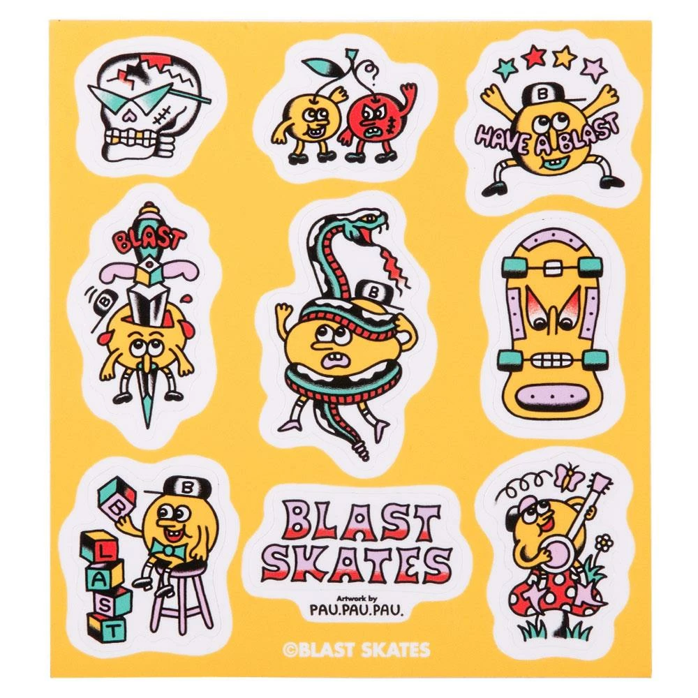 Blast skates flash sticker sheet, artwork by Pau.Pau.Pau The Blast Skates logo takes itโs inspiration from the 1950s/60s, the Mascot has a clear association with the brand and represents their playful approach. (160mm X 175mm)