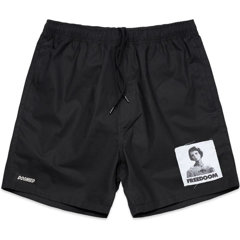 Elasticated waistband shorts from Doomed with screen printed patch on leg.
