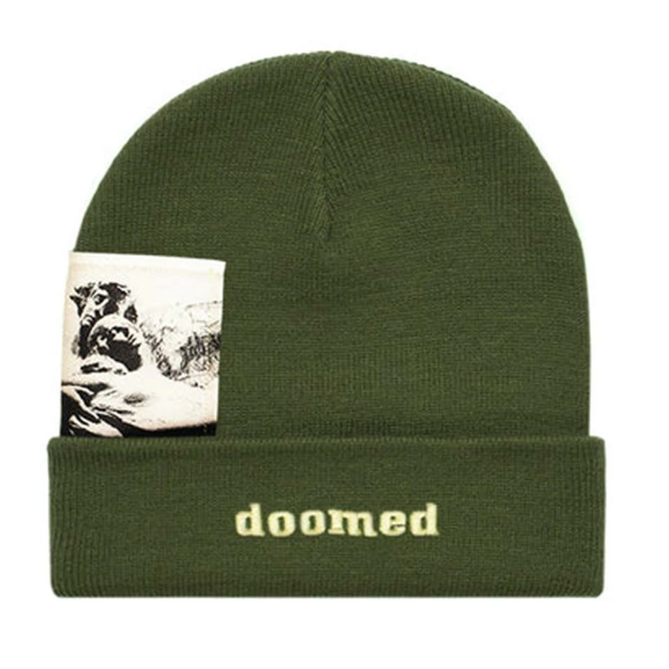 Doomed beanie with patch sewn into under cuff. Embroidered front.