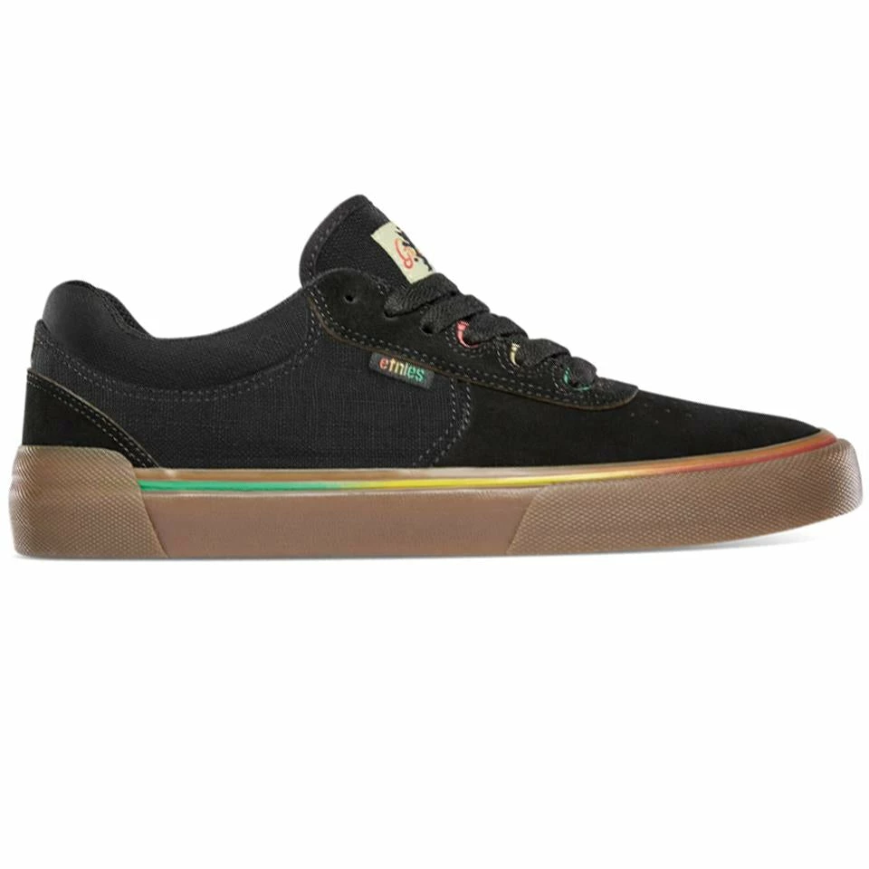 Etnies and Grizzly teamed up to put a subtle Rasta inspired colourway onto the Joslin Vulc silhouette, all black suede and synthetic uppers, red, gold and green accents to the lace eyelets and a three coloured foxing stripe.