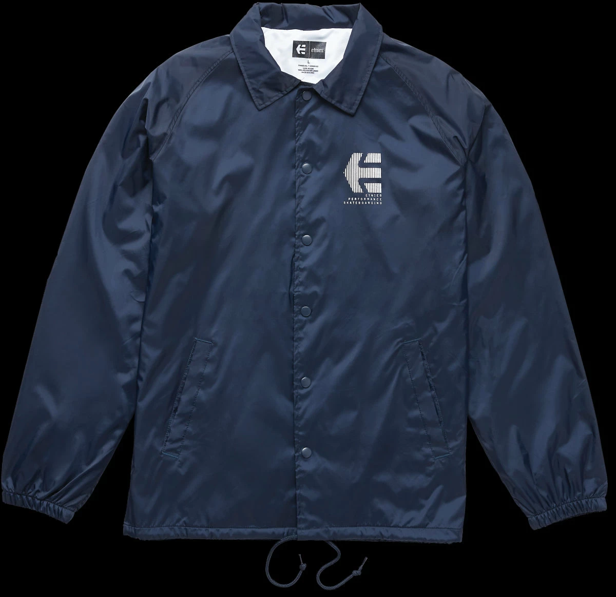 Nylon coaches jacket from Etnies featuring 100% polyester lining, elastic sleeve cuff, slanted welt pockets, metal snap closure, drawcord bottom opening and logo screenprint.