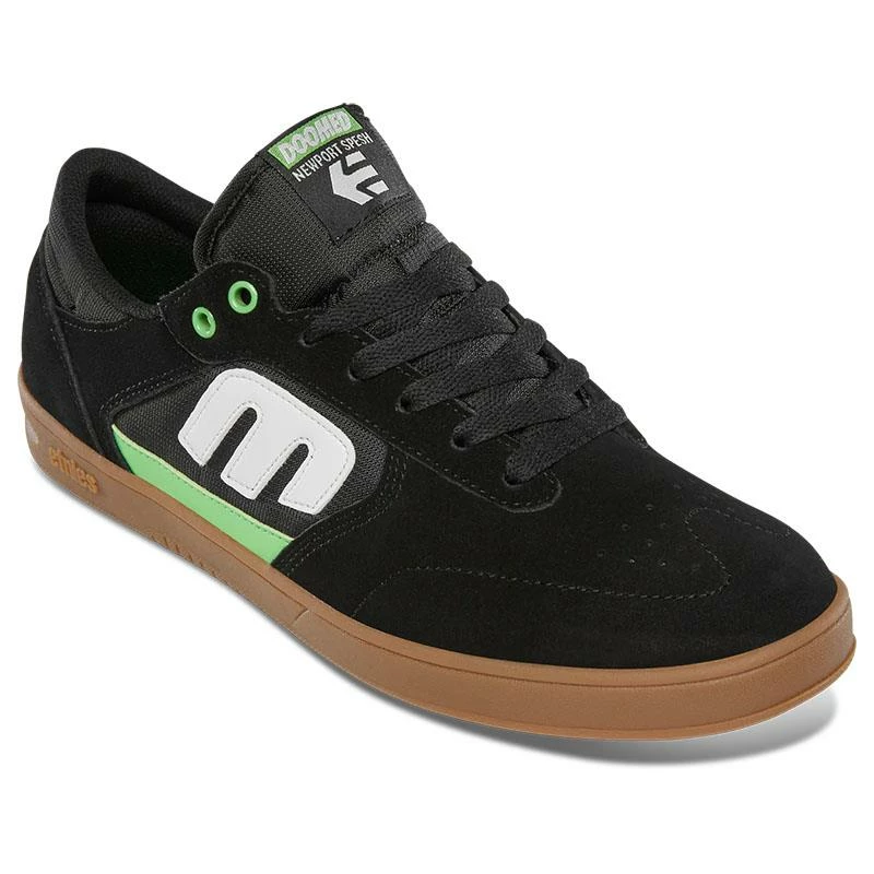 Etnies got Doomed in to give the Windrow low a new look. Doomed opted for that classic black and gum colourway as a starting point throwing in some vibrant green accents throughout.