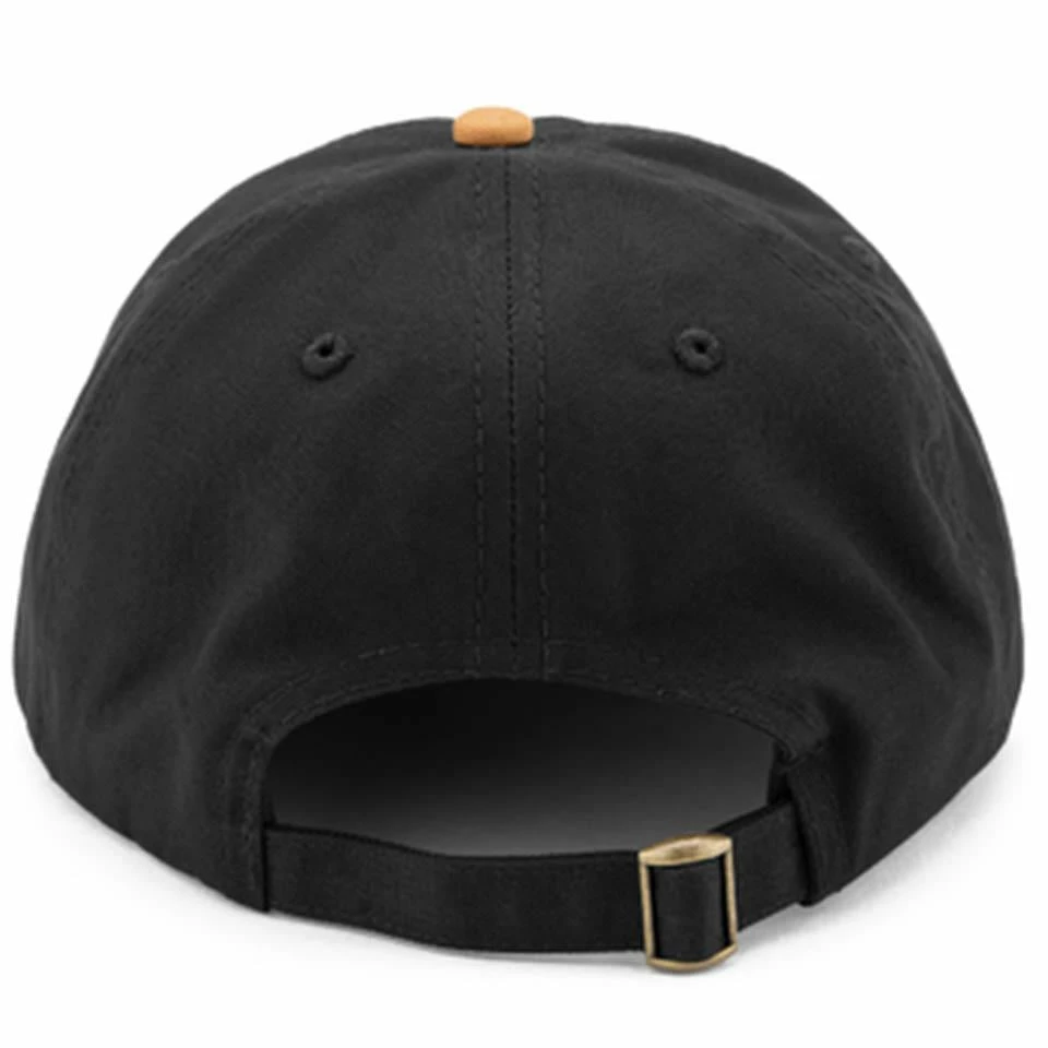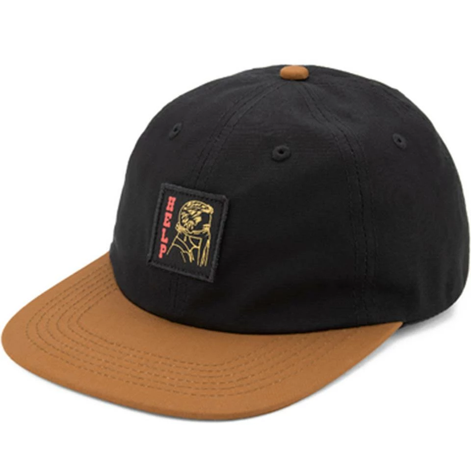 Unstructured 6-panel hat from Help with ultra low profile canvas crown, cotton twill brim and matching fabric strap.