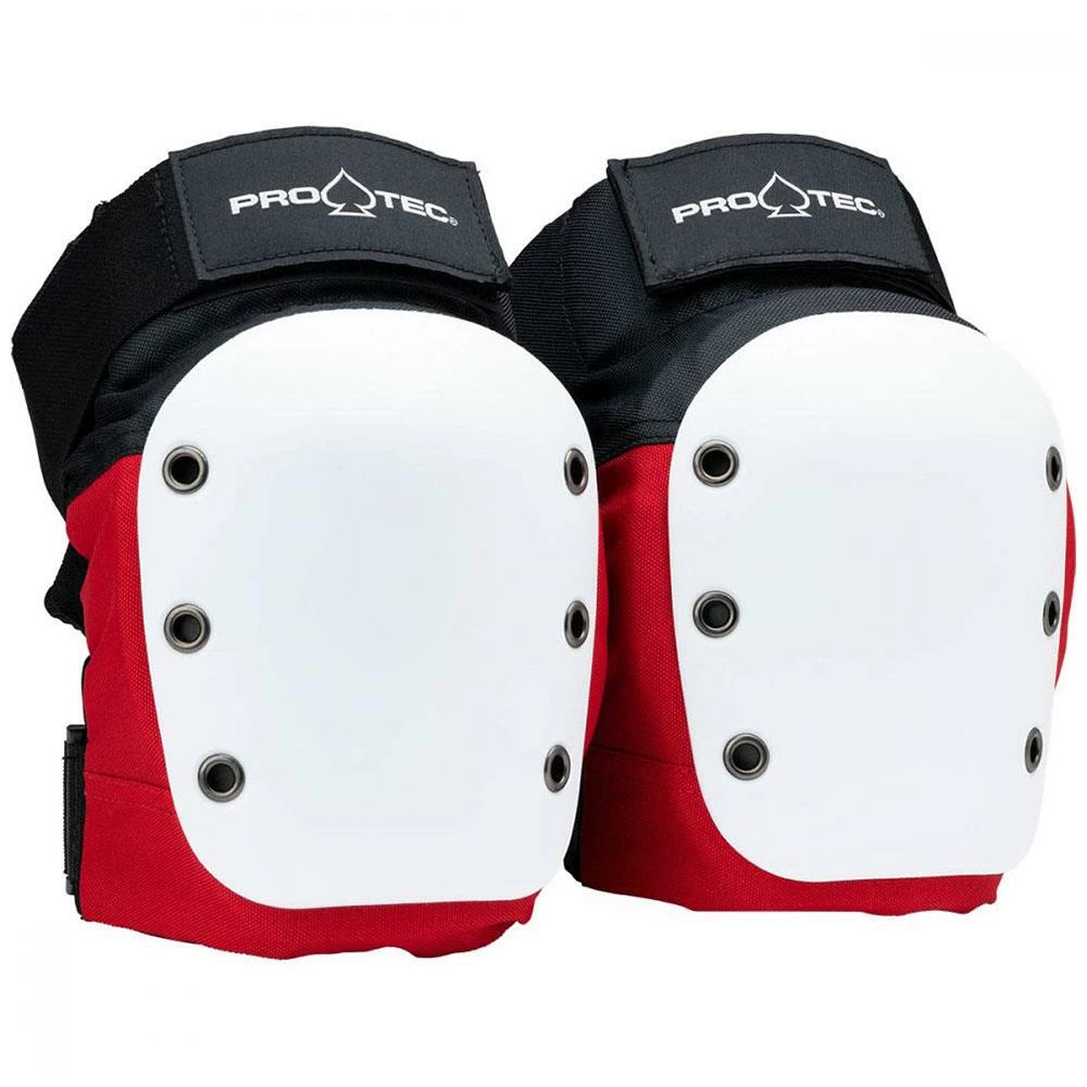Pro-Tec Street Knee Pad JR Open Back Pads (pair) Red/White/Black The Street Knee offers great protection for the pad wearer who wants non-bulky knee pads. The low profile, ultra-flexible body is perfect for street, park, and learning new tricks. Locked in EVA foam, a combination of thick and thin padding with an ergonomic design that βlocks inβ your elbows for optimal fit and maximum protection. Ballistic Nylon, ultra-tough ballistic nylon that resists tears and protects your elbows from skids and scrapes. Perforated Neoprene, allows for better ventilation keeping you cool and dry.