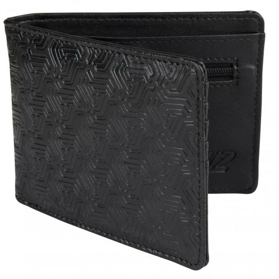 PU bi-fold wallet with inside zip coin pocket, card and note slots, all-over emboss pattern and inside emboss logo