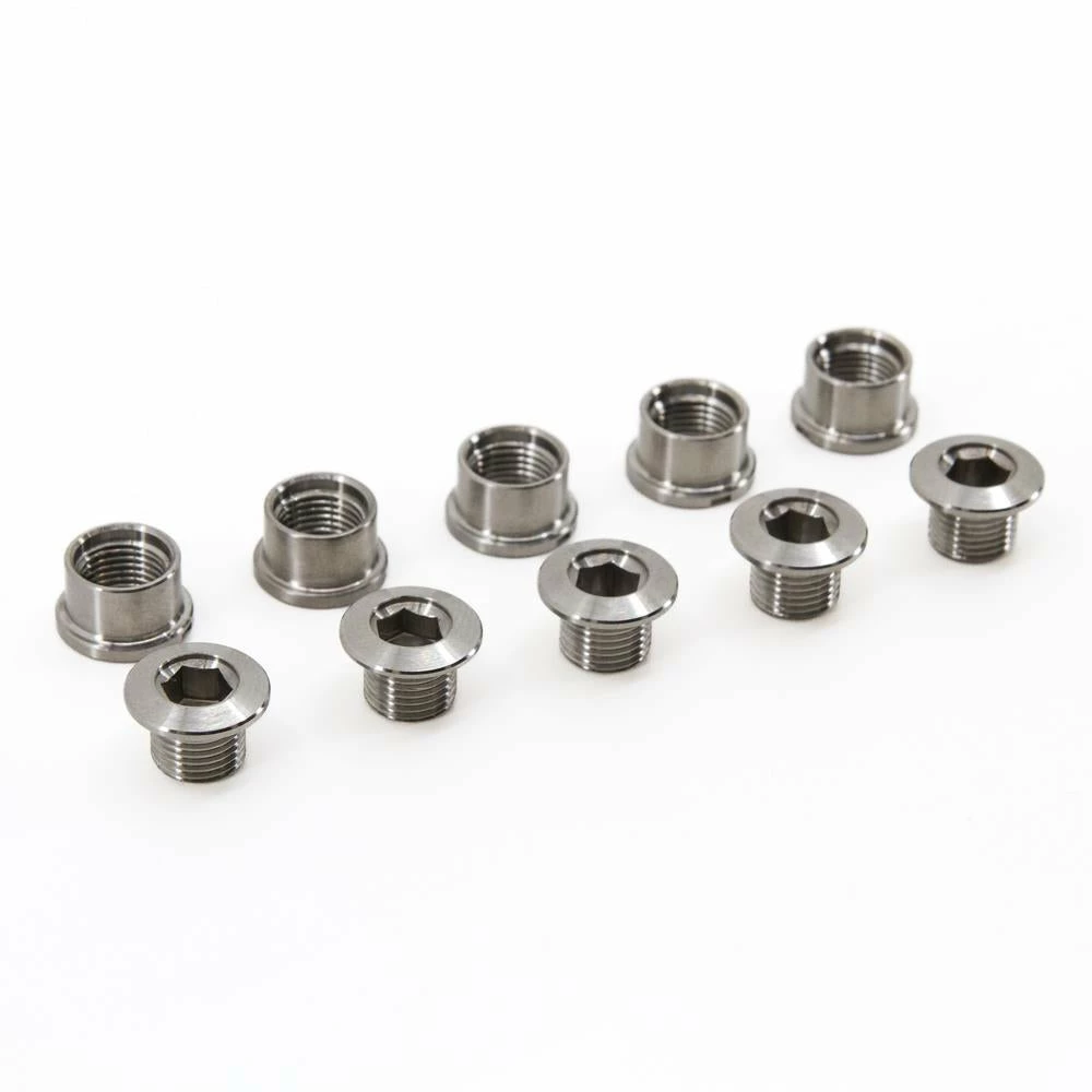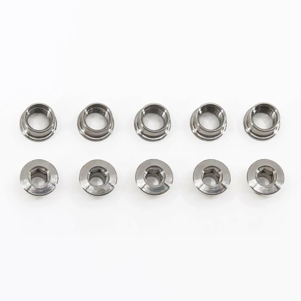 Full set of 5 replacement chainring bolts, with 6mm front bolts and 5mm rear bolts. Will fit majority of chain rings. When installing these on your bike please use adequate lubrication or anti-seize to prevent corrosion, seizing or cold welding.