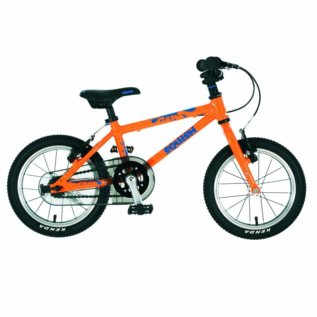 The perfect introduction to 2 wheels! The Squish 14 has been built to be as lightweight, and as easy to use as possible. 14″ wheels and an 8″ triple butted frame make it ideal for riders of 3 years and above. With it’s shortened crank arms, stubby stem, short reach brake levers and funky Selle Royal/Squish co-branded saddle, it not only looks cool but is ideally in proportion with it’s intended rider. We’ve even treated the rims to CNC sidewalls to help increase braking performance and safely tucked away the chain and cogs with a fully enclosed chainguard, great for protecting clothes…and curious little fingers! All this, and weighing just 5.83kg