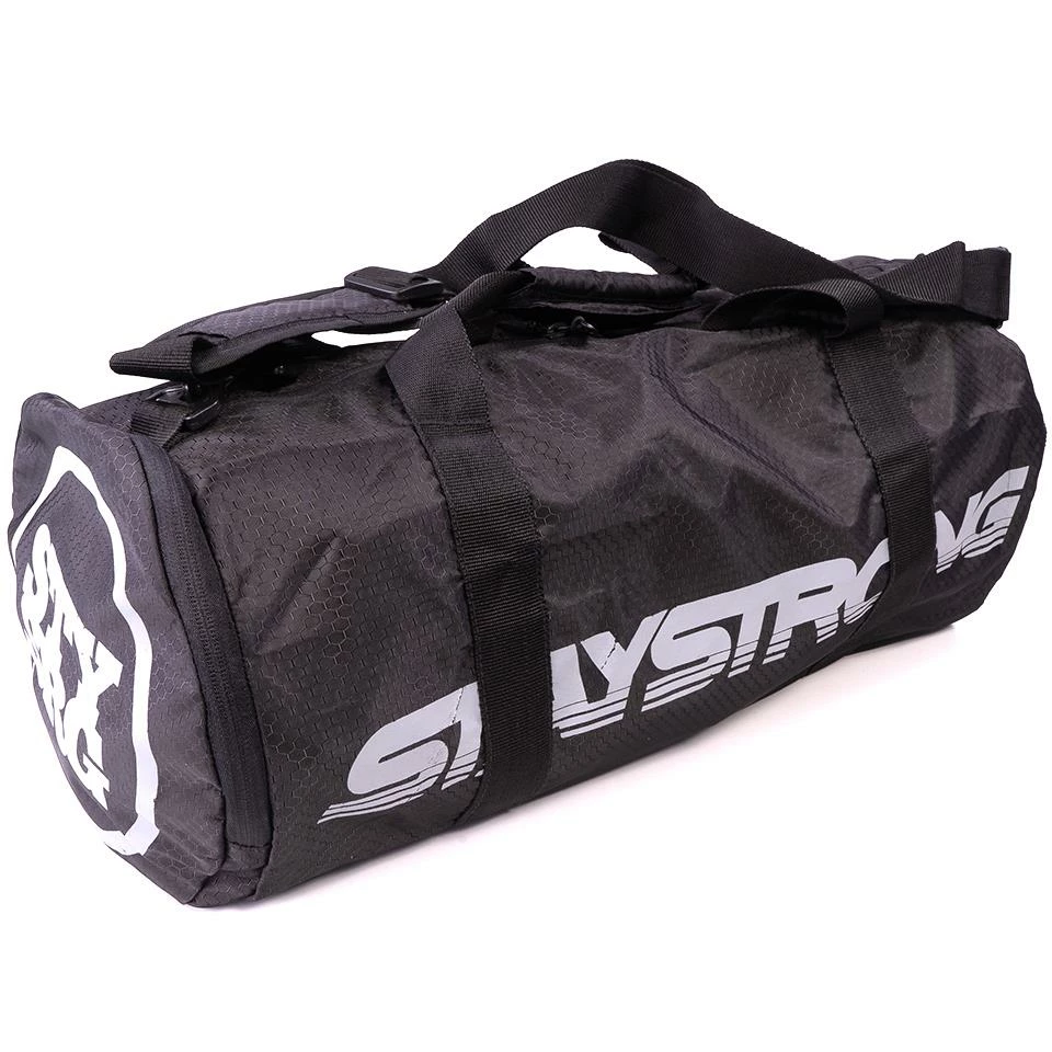 The Stay Strong gym bag featuring rip stop fabric, hand & padded shoulder strap, elasticated mesh pocket one end and shoe shoot end pocket, keeps dirty shoes or gym kit away from clean. Internal security zip pocket.