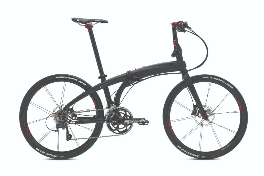 TheΒ Tern Eclipse X22Β is designed to be the fastest folding bike in the world. With hand-built 26β wheels and race-tuned geometry, itβs a full sized road bike, but it folds down small in 10 seconds. It boasts an Ultegra drivetrain, and a set of Shimano hydraulic disc brakes. With a stealth black finish, hydroformed fork, red Syntace accents, and perfected engineering, the X22 inaugurates a new chapter in Tern design.