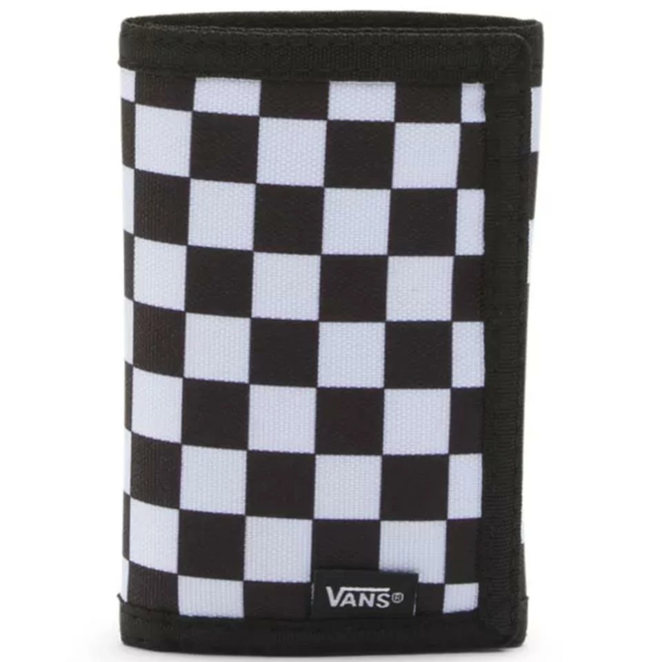 The Slipped Wallet is a 100% polyester tri-fold wallet with an allover checkerboard print. It features an ample billfold, card slots, an ID window, and a coin pocket.